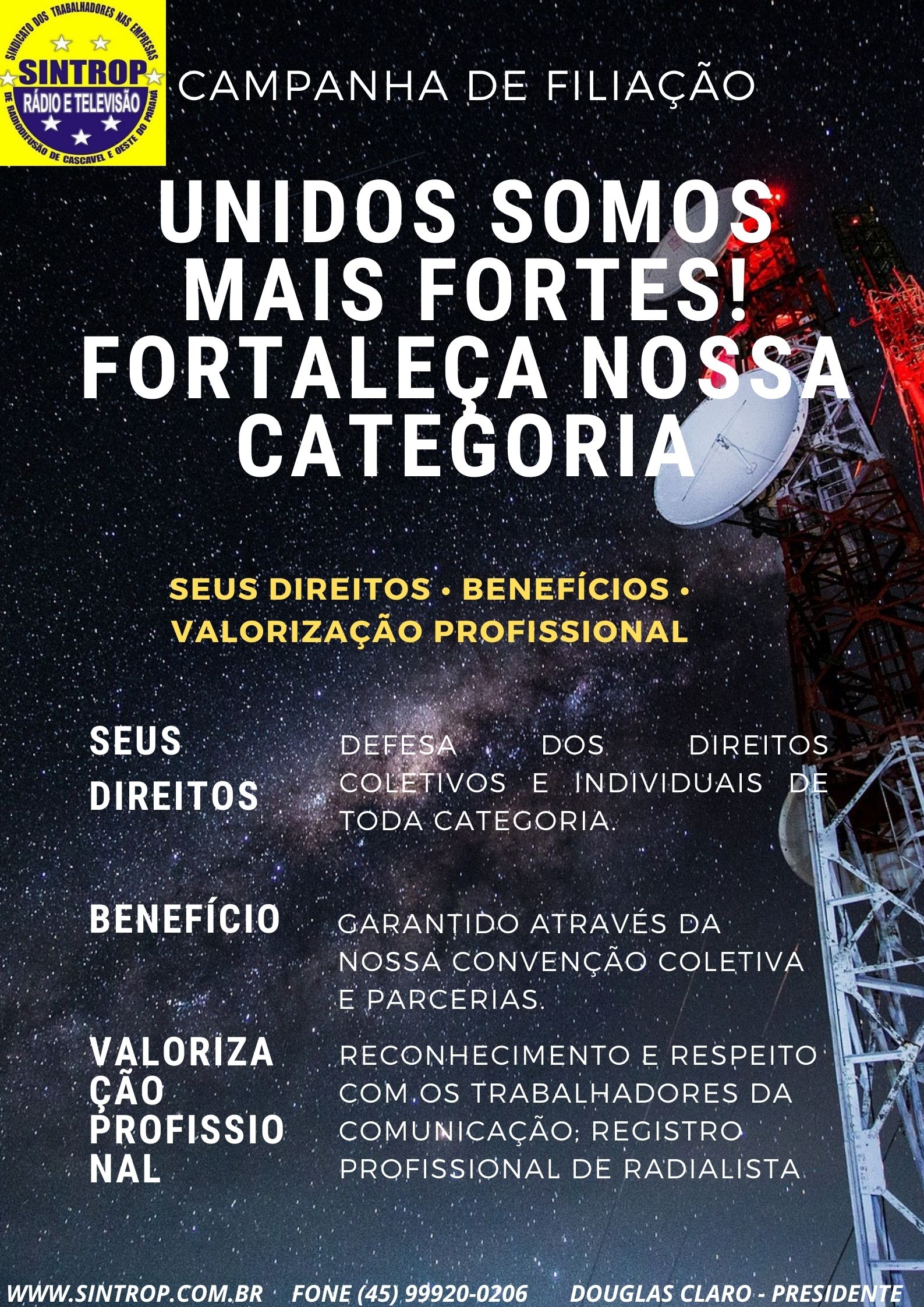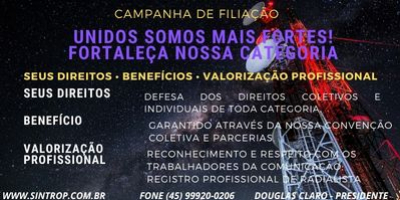 O Sintrop Sindicato de Rádio e Televisão lança a partir de hoje 07/10/2021 uma campanha permante de FILIAÇÃO. Junte-se a nós e fortaleça nossa categoria. Esperamos por vocês!!!